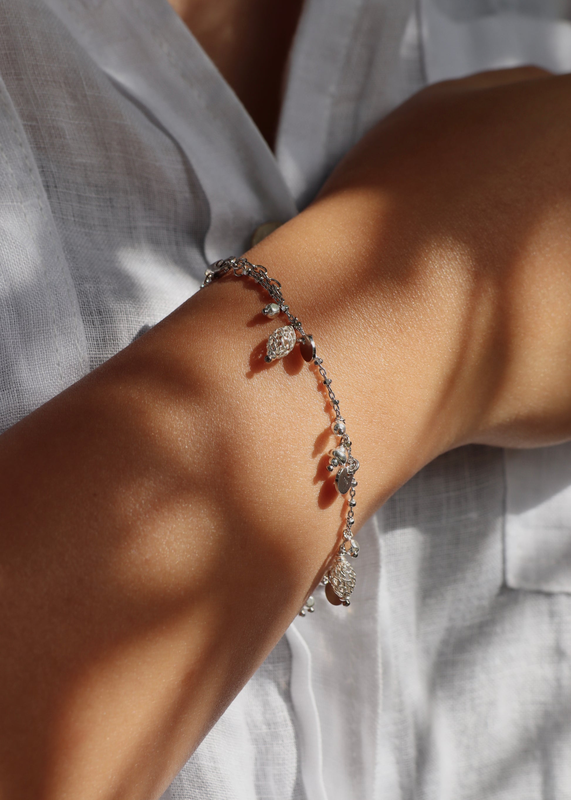 - Ciondoli: Rotondi, lucidi e in argento, disposti lungo il bracciale per un effetto leggero e giocoso