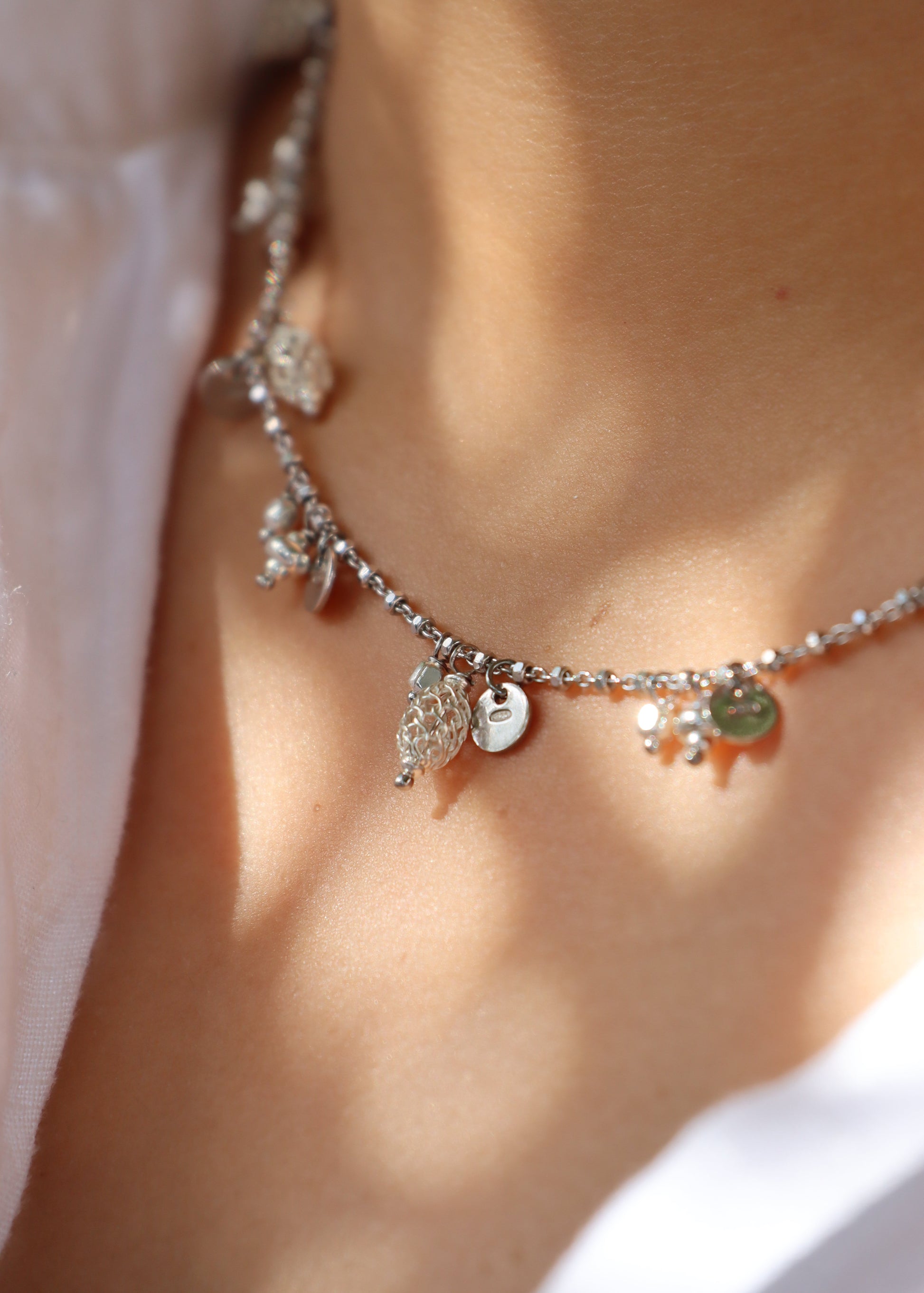 - Ciondoli: Rotondi, lucidi e in argento, disposti lungo la catena per un effetto leggero e giocoso