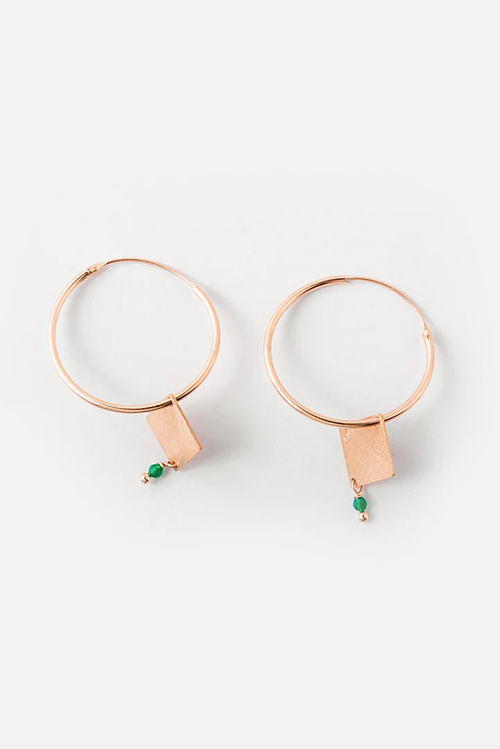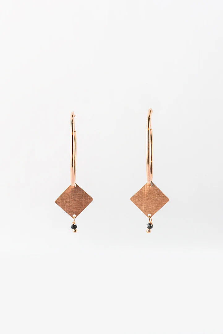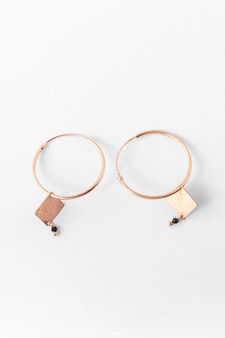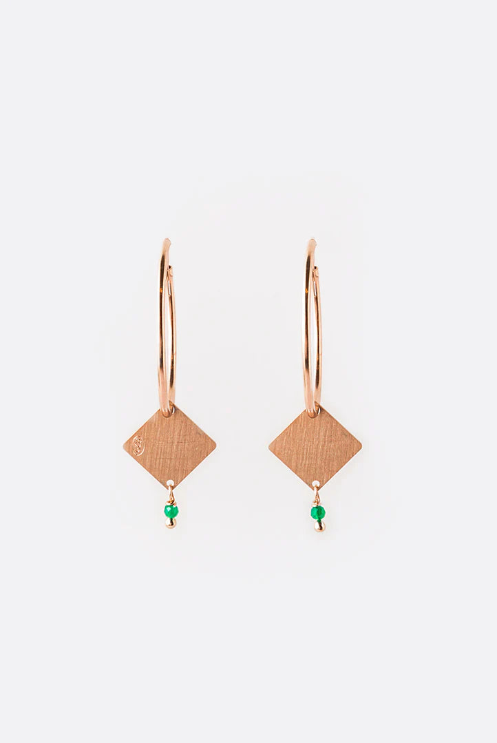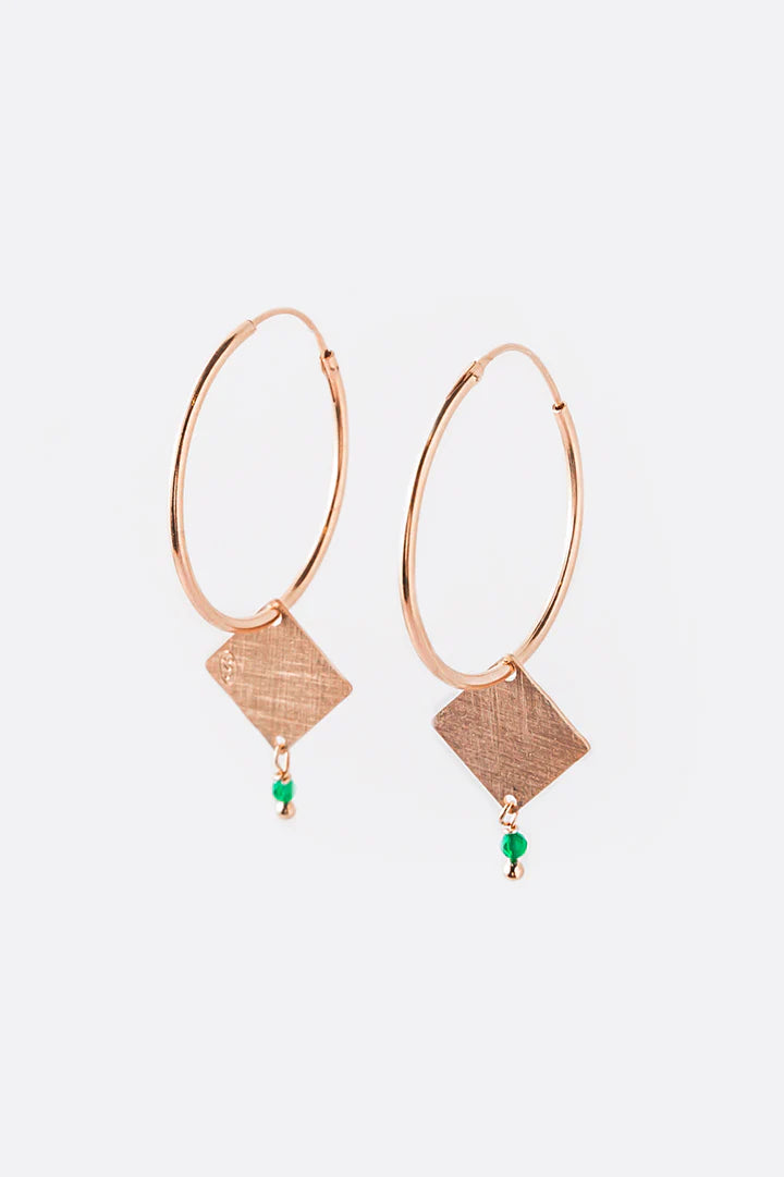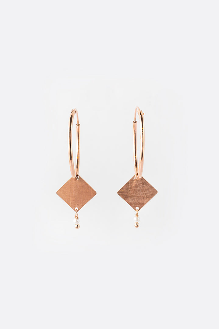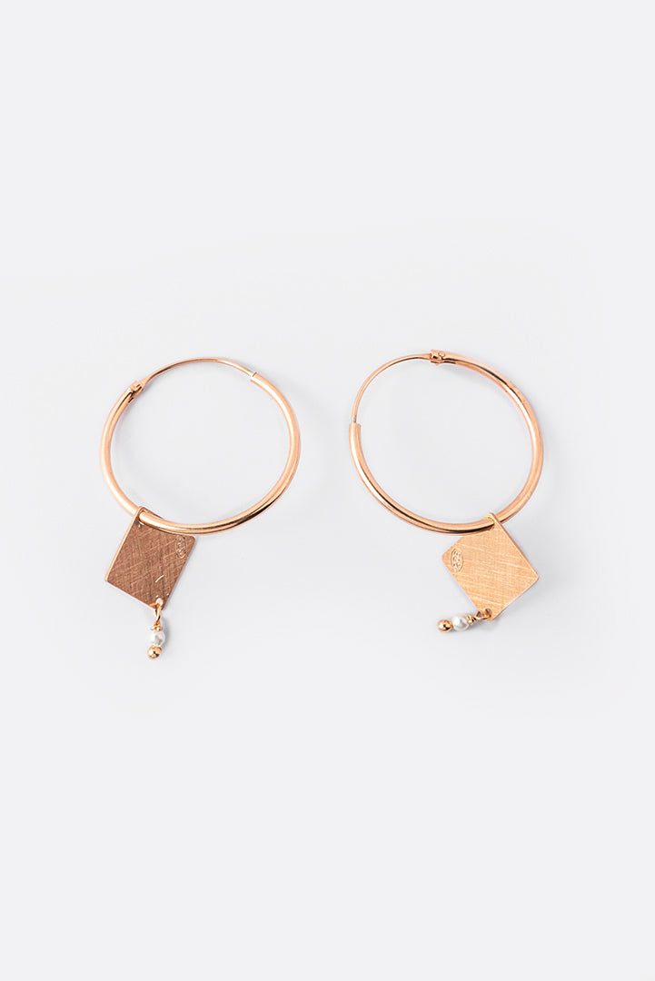 Orecchino ad anella in argento satinato placcato in oro rosa, un bijoux ricercato nella sua semplicità. Ciondolo geometrico con appendice di pietra dura o perla, disponibili varie combinazioni di forme e colori.