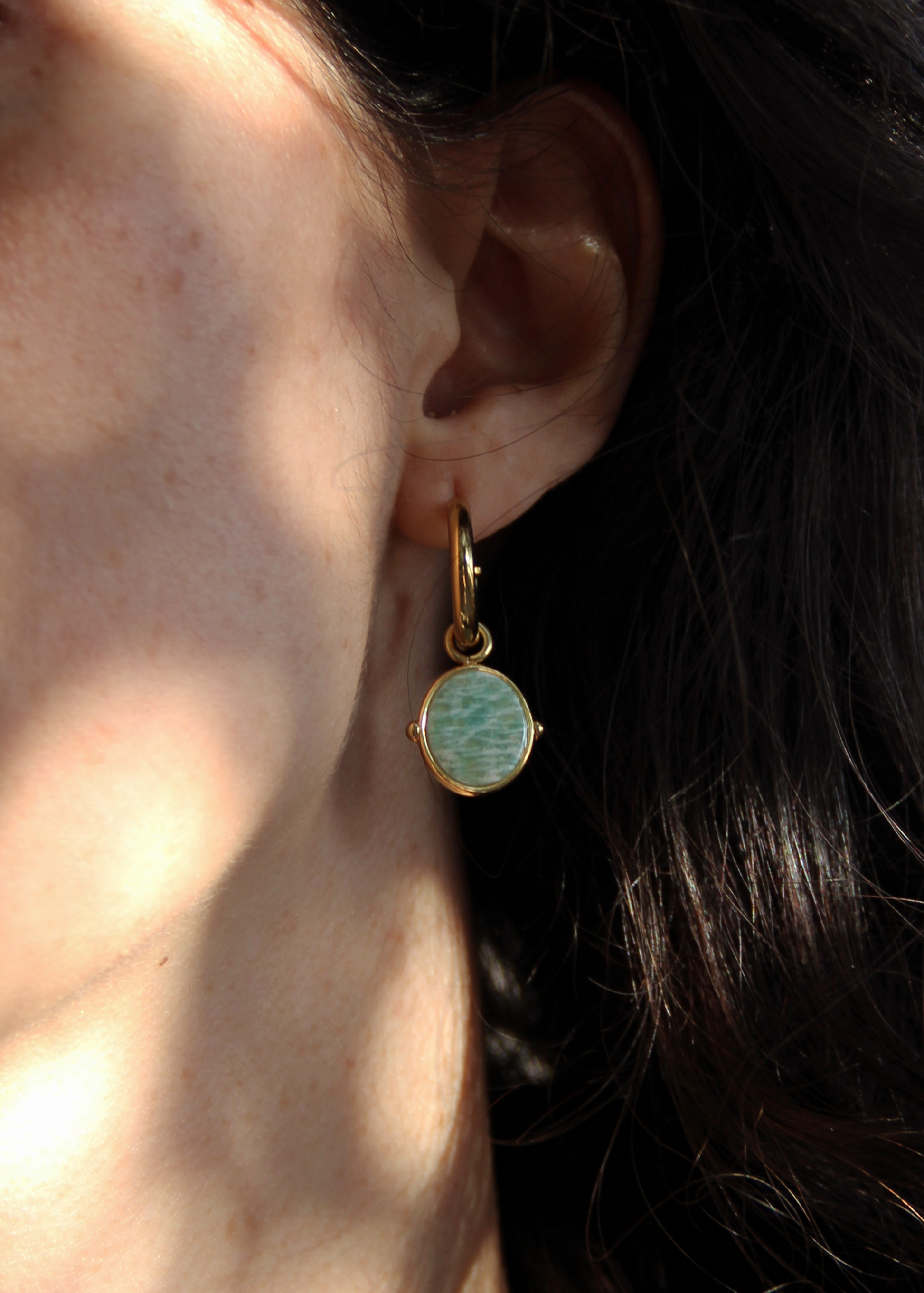 Orecchini a cerchio in acciaio placcato oro con pendente ovale in pietra dura naturale. Cerchio liscio con chiusura a perno. Disponibile in diversi colori, dal design elegante e senza tempo. Scegli la pietra che più ti rappresenta!